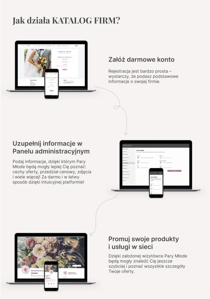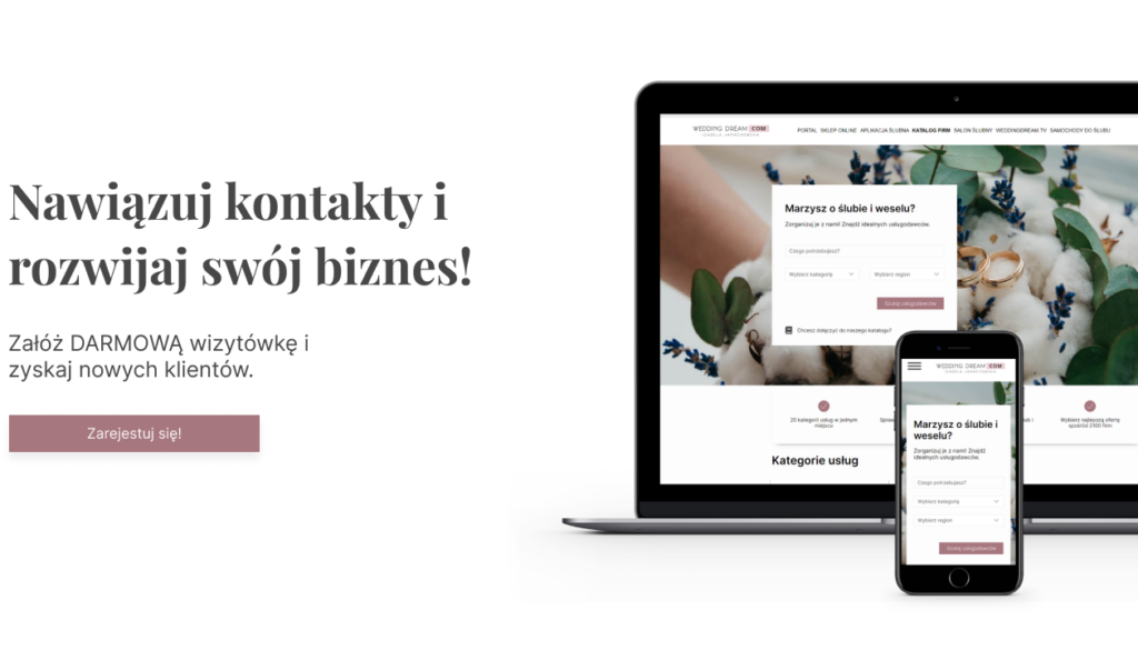 Wedding Dream is a Polish company from wedding industry. One of the company’s projects is the Company Directory, a website that brings together service providers from the industry and allows them to present their offer to potential customers. To do so, they must create an account on this website, complete the necessary data related to their offer and the company provides them with its platform. The redesign of the landing page for wedding companies was implemented as part of a redesign project for the entire platform.