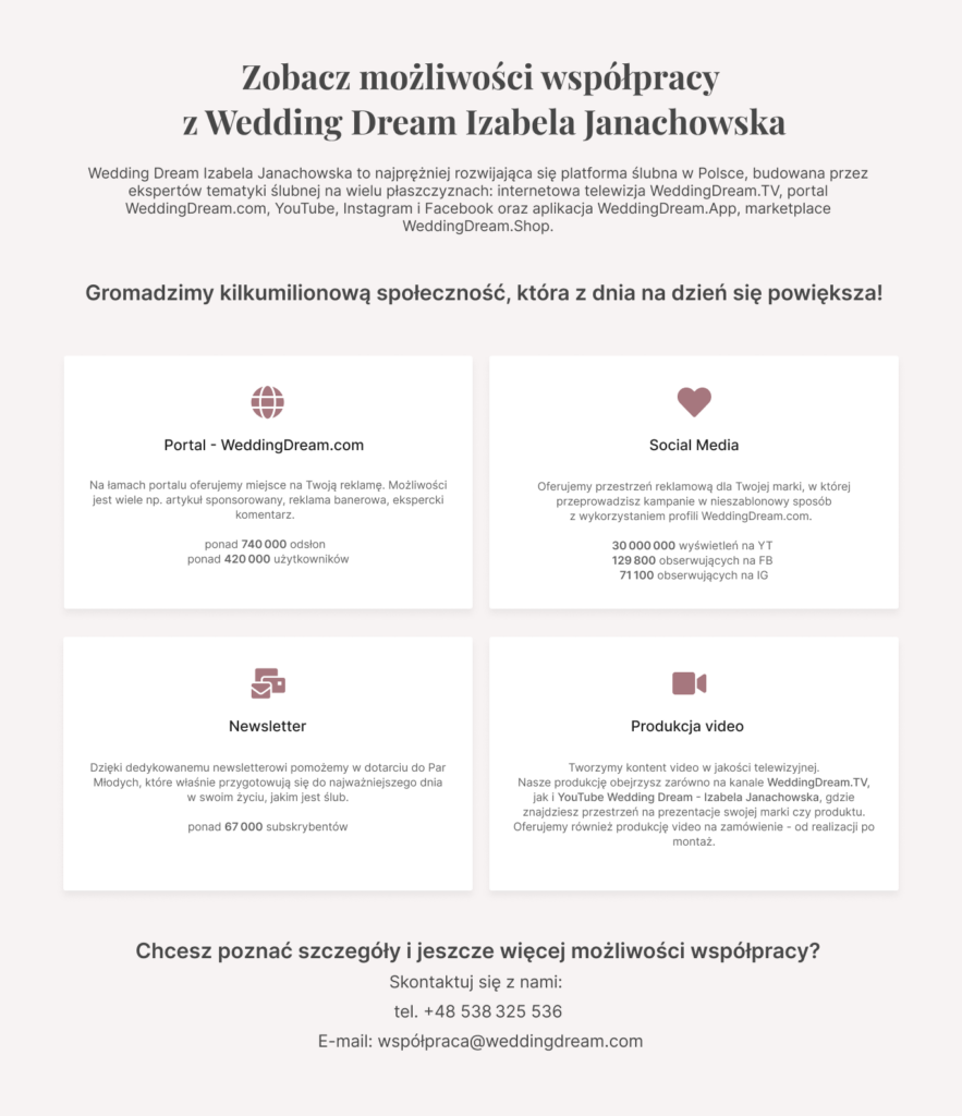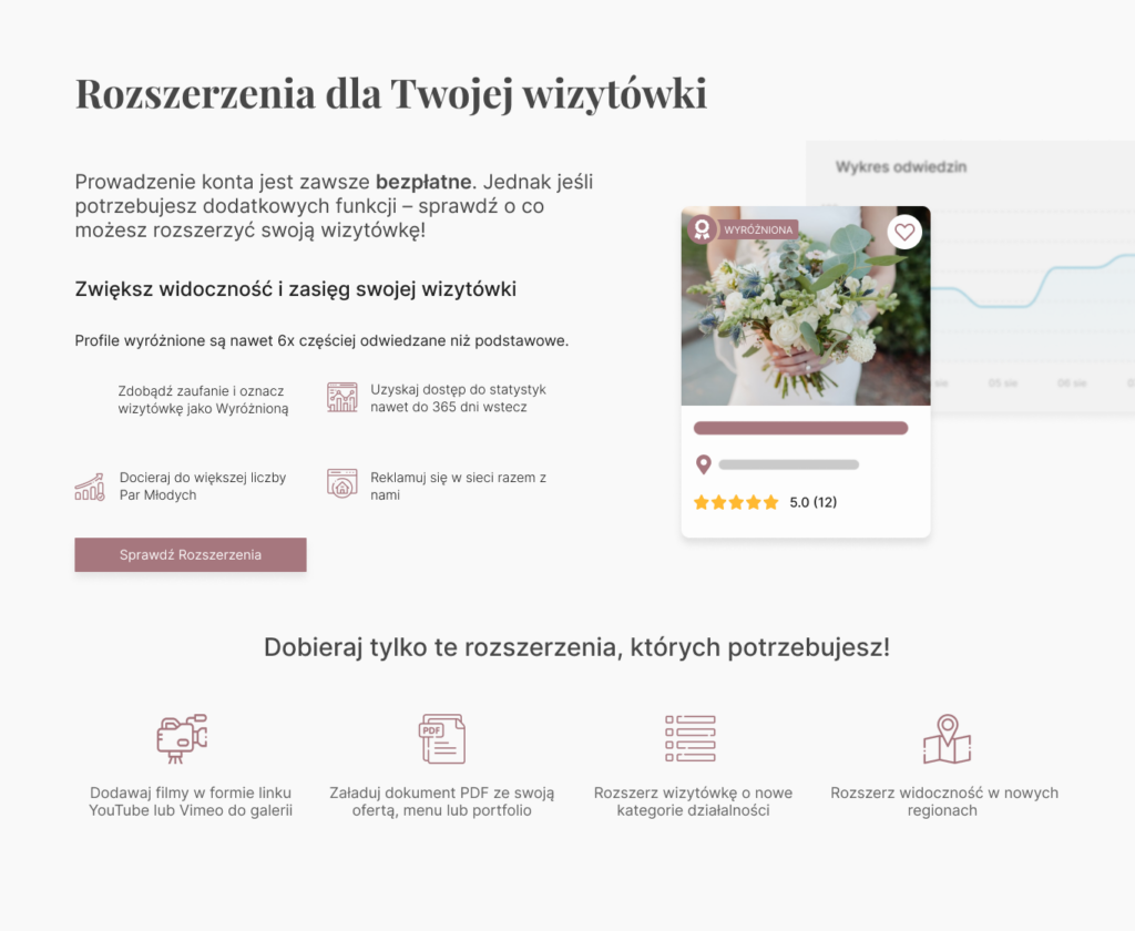 4. Paid promotion – The service also features a wide range of enhancements that allow companies in the wedding industry to add more elements to their offer or enhance the display. However, it is important that the service does not charge a fixed fee, and users select additional items according to their needs and decide for themselves whether and which items they need. That’s why it was important to show on the landing page that the purchase of an offer is optional and the company does not charge any account maintenance fees.