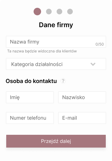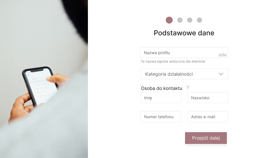 The first step to get basic information about company is: profile name, category and contact persons for potential customers. Without this data, the profile cannot really work, so they were chosen as the first step. The completion of all information is obligatory, but does not pose a problem for users, as every offer must have this information.