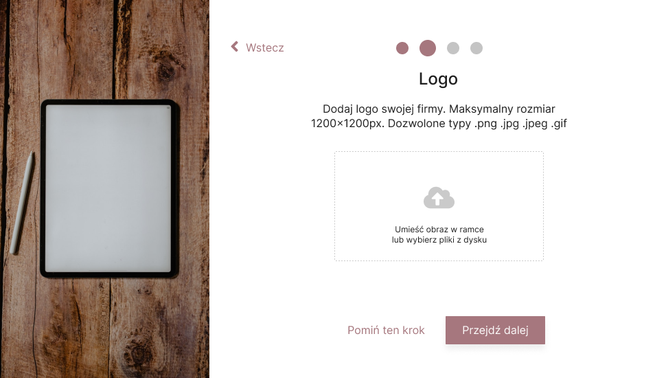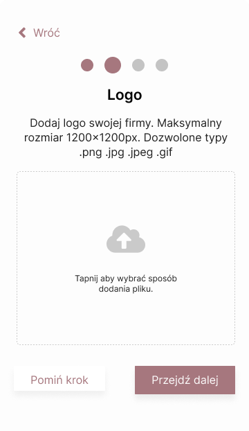 The next step is to add a company logo. The logo is an element of the company identity and allows customers to get to know the company better However, it is not mandatory to attach it, as we know that not every company has a logo or may not have a logo stored on the hard drive of the computer it is currently using or in the gallery of the phone. For this reason, they have the option to upload them later via the admin panel.