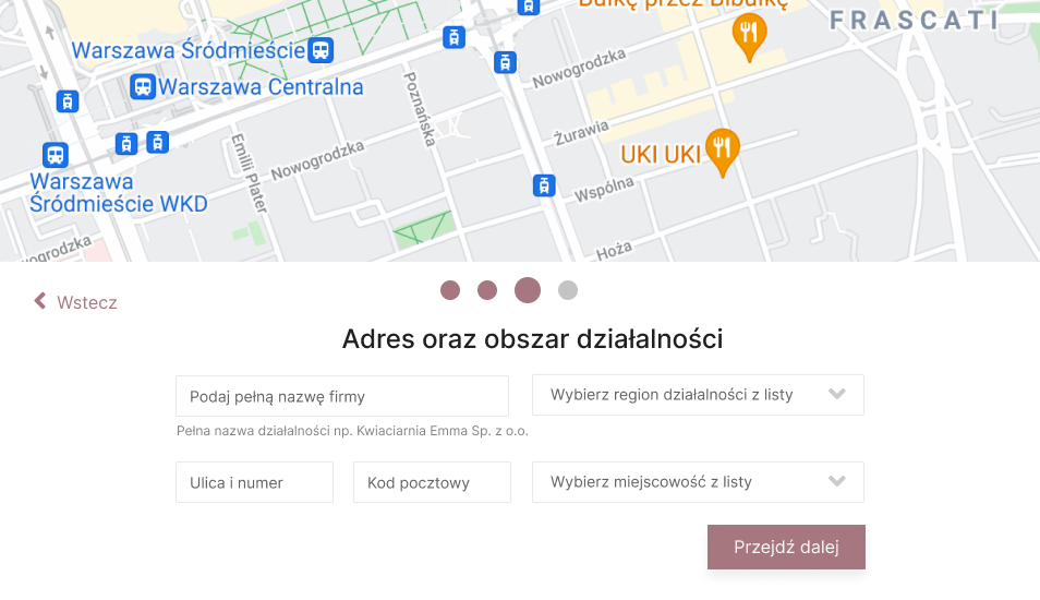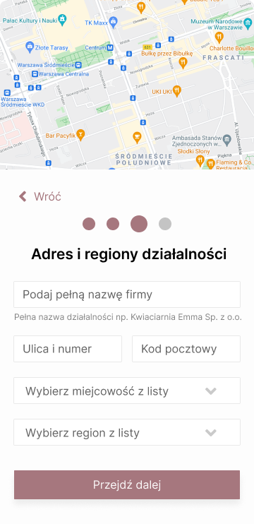 Step three is the indication of the company address and business area. This is a mandatory part as it has a big impact on the decision of potential customers to send a message. Bridal couples usually look for companies in their vicinity, as they usually have no travel costs and it is also easier to meet to discuss the details of the offer or to visit the location (e.g. wedding halls). Therefore, it is important that each offer has a specific location and a specific area of activity (voivodship). The indication of the voivodship is also important from the point of view of the search mechanism on the website, as it was built in this key (category – voivodship).